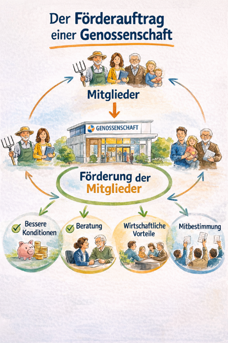 Der Förderauftrag bildet damit den inneren Kompass jeder Genossenschaft. Der Grundgedanke lässt sich einfach zusammenfassen: Die Genossenschaft existiert, um ihre Mitglieder zu fördern.