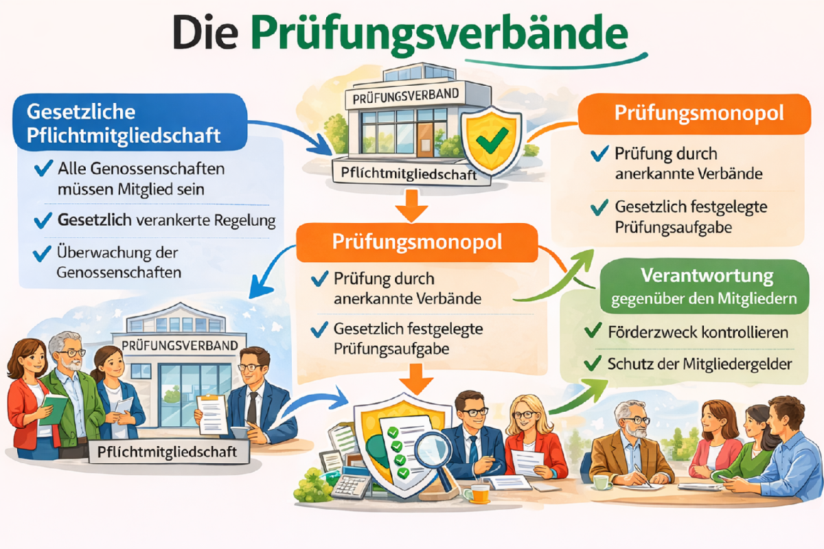 Warum gibt es Prüfungsverbände? Das Genossenschaftsgesetz hat ein besonderes Prüfsystem geschaffen, um die Mitglieder zu schützen und die Stabilität der Genossenschaften zu sichern. Die Prüfungsverbände verfügen über spezielle Erfahrung im genossenschaftlichen Bereich und kennen die Besonderheiten dieser Rechtsform. Durch die regelmäßigen Prüfungen soll sichergestellt werden, dass Genossenschaften wirtschaftlich solide arbeiten und ordnungsgemäß geführt werden.